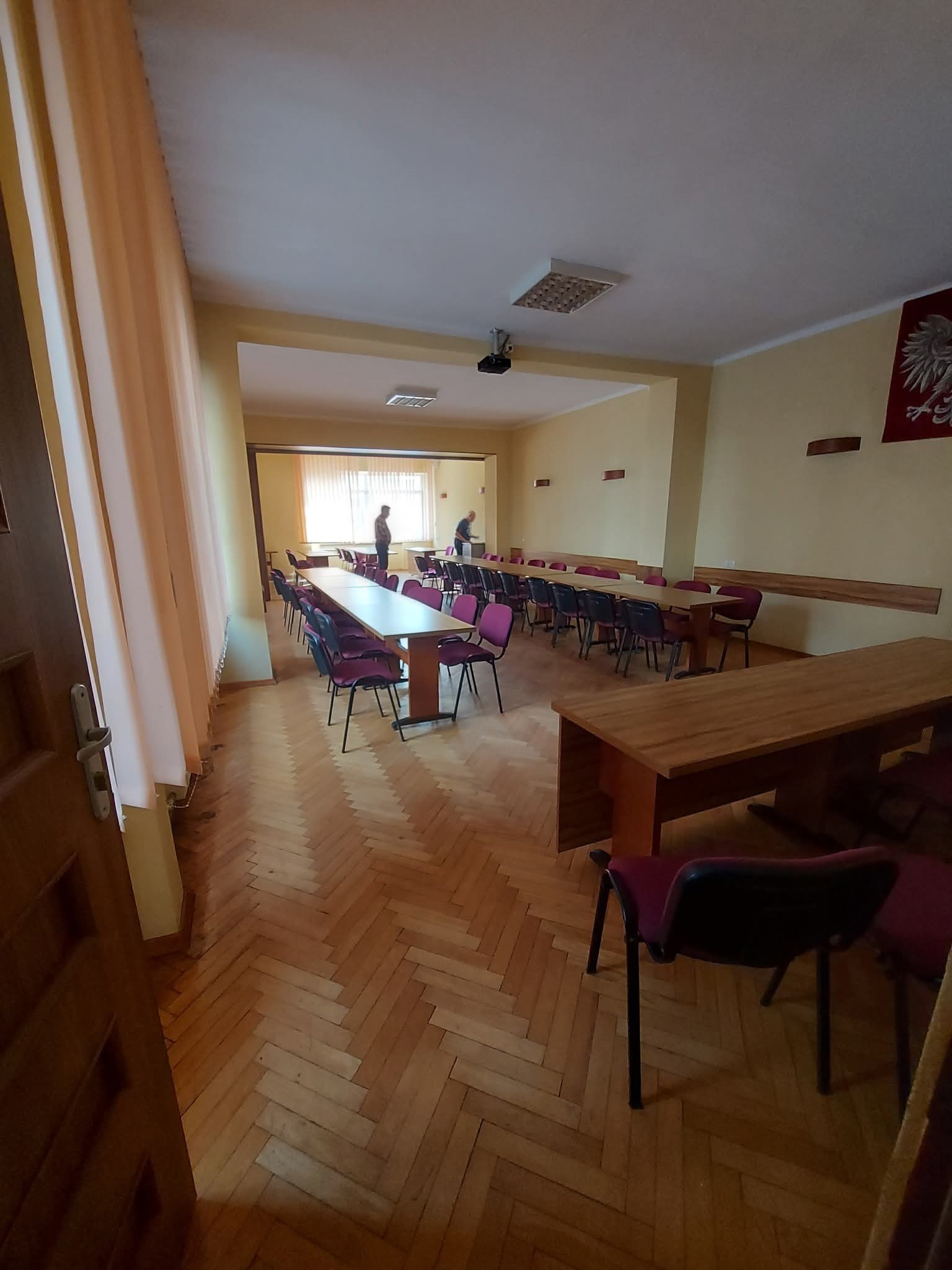 Jednym z kluczowych elementów modernizacji było nowe oświetlenie. Wykonano dekoracyjne oświetlenie LED wokół sufitu, które podkreśla jego formę i wprowadza przyjemną, ciepłą atmosferę. Dodatkowo zamontowano trzy stylowe żyrandole, które stanowią centralny element dekoracyjny sali, a także kinkiety ścienne i punkty świetlne, zapewniające równomierne i funkcjonalne doświetlenie całej przestrzeni.